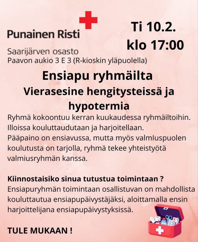 Saarijärven ensiapuryhmän ryhmäilta jälleen 24.3 klo18 SPR:n toimistolla, Paavonaukio 3, Saarijärvi.